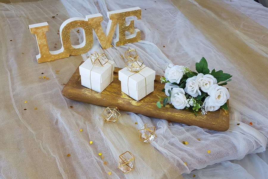 - Στρώσε λευκό τραπέζομάντηλο και σκόρπισε χρυσόσκονη, χρυσά κονφετί καρδιές ή glam διακοσμητικά διαμάντια στα τραπέζια.
