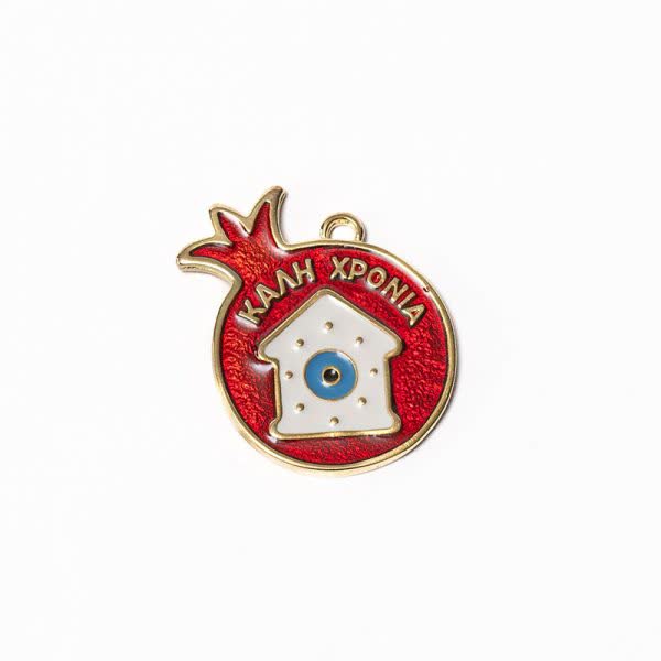 Γούρι μεταλλικό ρόδι ΚΑΛΗ ΧΡΟΝΙΑ με σπιτάκι ματάκι και κόκκινο σμάλτο