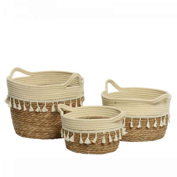 Καλάθι ψάθινο εκρού με κορδόνι, κρόσια και χερούλια