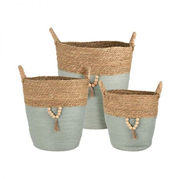 Καλάθι πλεκτό ψάθινο δίχρωμο με χεράκια και ξύλινες χάντρες 30 εκ. x 28 εκ. x 35 εκ. (1 τεμ. )