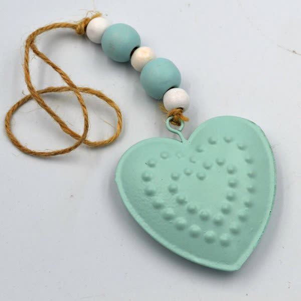 Καρδιά μεταλλική κρεμαστή σιέλ με ξύλινες χάντρες 7 εκ. (1 τεμ.)