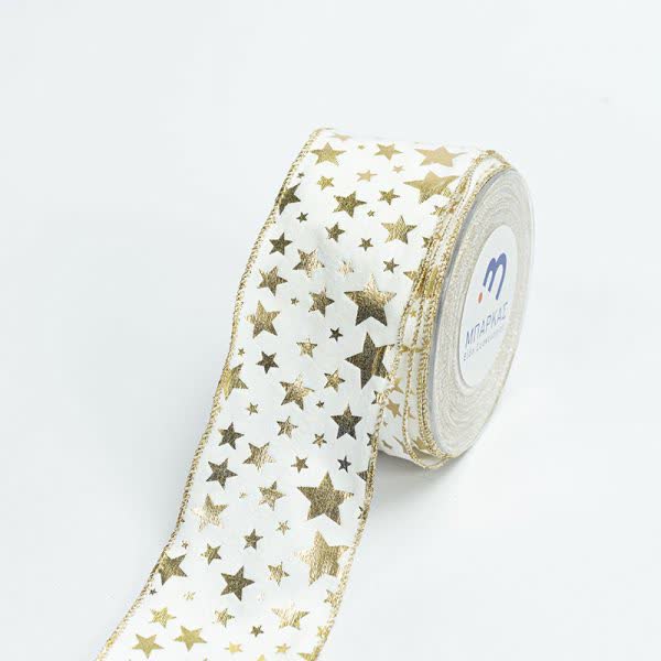 Κορδέλα Χριστουγεννιάτικη βελούδινη με χρυσά αστέρια εκρού και σύρμα 6,7 cm. x 9 m.