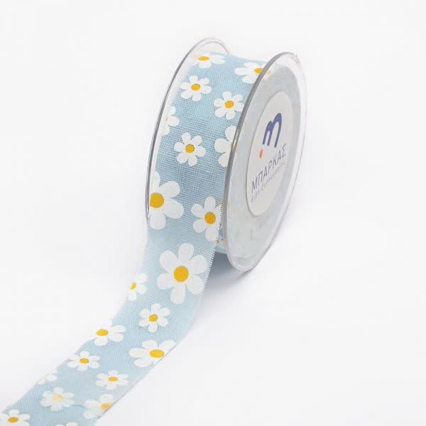 Κορδέλα υφασμάτινη με μαργαρίτες σε σιέλ χρώμα 3,5 εκ. Χ 9 μ.