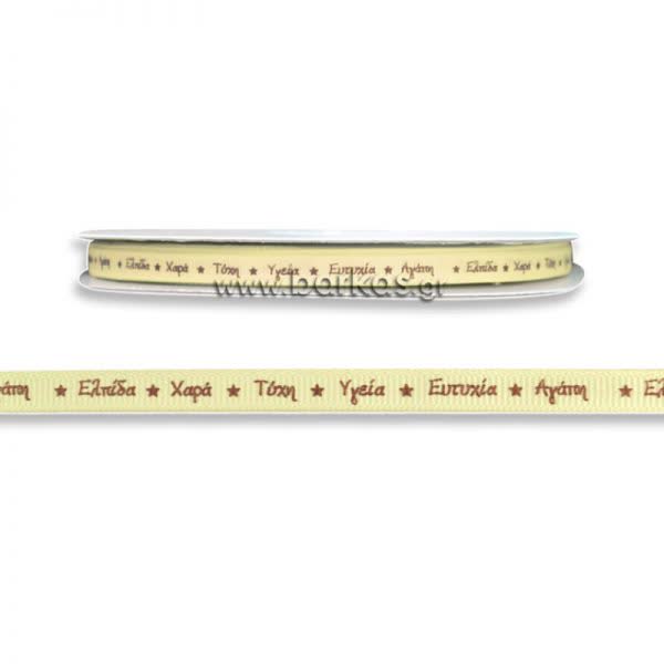 Κορδέλα γκρό Ευχές εκρού με καφέ εκτύπωση.rΔιάσταση: 6mm. x 50m.