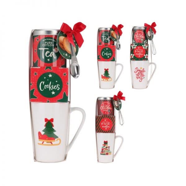 Κούπα σε 3 Χριστουγεννιάτικα σχέδια σε συσκευασία δώρου με διάφορα ροφήματα, μπισκότα και κουταλάκι