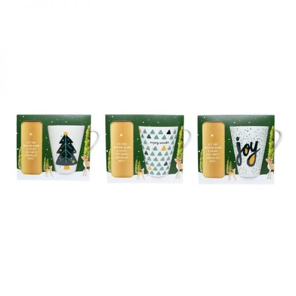 Κούπα σε 3 Χριστουγεννιάτικα σχέδια σε συσκευασία δώρου με σοκολάκια πραλίνες καραμέλας.