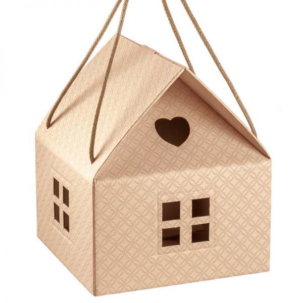 Ένα ιδιαίτερο κουτί σε σχήμα σπιτάκι με διάτρητες λεπτομέρειες και κορδόνι.