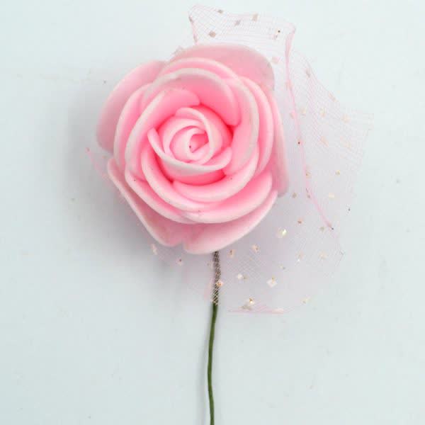 Λουλούδι τριαντάφυλλο ροζ με τούλι με κοτσάνι από συρματάκι.