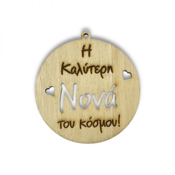 Ξύλινη μπάλα με αφιέρωση ‘Η καλύτερη Νονά’, με τρύπα.