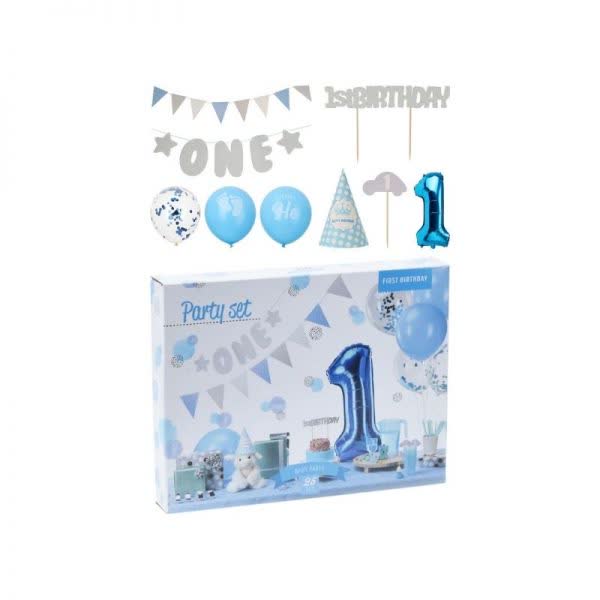 Το σετ περιέχει: Γιρλάντα ONE ,Καπέλο, Μπαλόνι νο. 1, μπαλόνια με κομφετί, μπαλόνια με εκτύπωση, Cake Topper 1st Birthday, κ.α