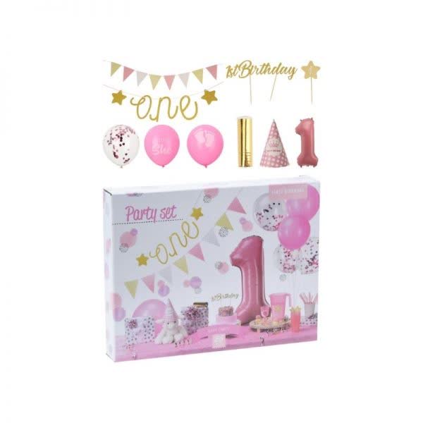 Το σετ περιέχει: Γιρλάντα ONE ,Καπέλο, Μπαλόνι νο. 1, μπαλόνια με κομφετί, μπαλόνια με εκτύπωση, Cake Topper 1st Birthday, κ.α