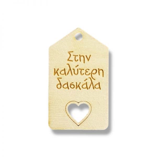 Ξύλινο tag με αφιέρωσηΣτην καλύτερη δασκάλα και διάτρητη καρδούλα, με τρύπα.
