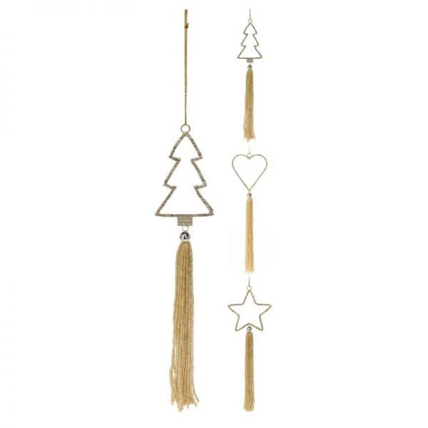 Στολίδι Χριστουγεννιάτικο μεταλλικό με στρας με φούντα από χάντρες σε 3 σχέδια (δέντρο, αστέρι καρδιά)
