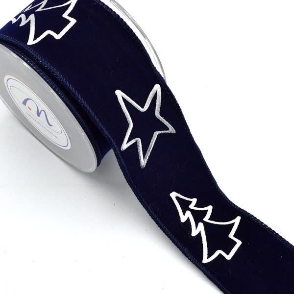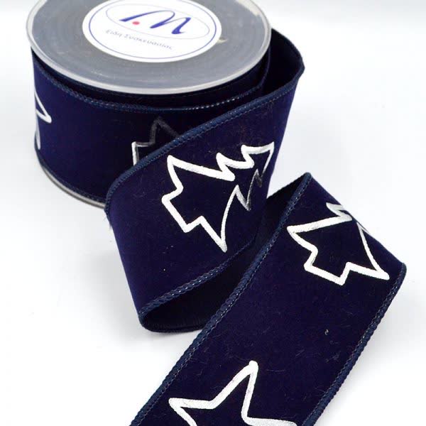 Χριστουγεννιάτικη κορδέλα βελούδινη μπλέ με ασημί δεντράκια και αστεράκια.
