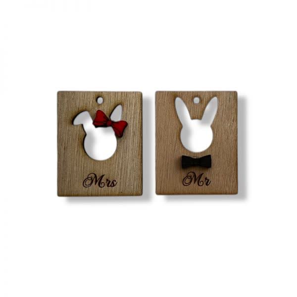 Ξύλινα tag με διάτρητο κεφάλι λαγού Mr & Mrs με τρύπα.